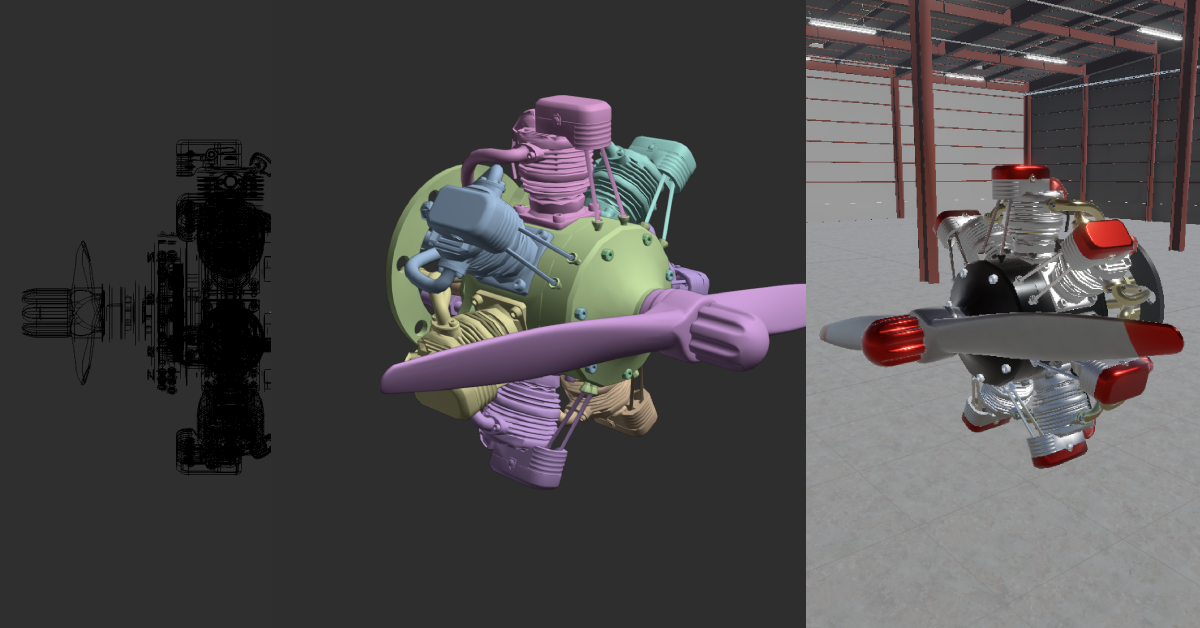 Once the CAD model is imported, it’s almost always overbuilt for real-time use. The goal here is to trim mesh complexity without breaking what makes it look engineered.