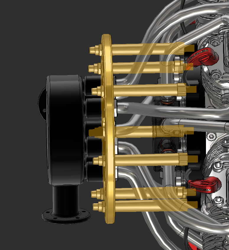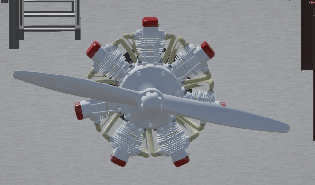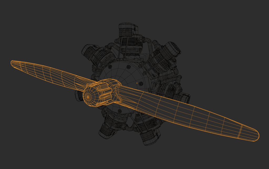 Separate the model into its respective parts, ensuring that repeated parts, such as bolts or injector heads, are kept distinct so that they can be instanced in Unity.