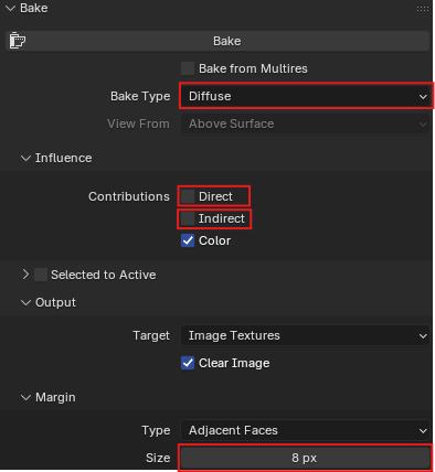 For settings, I make sure to select diffuse as the bake type, disable Direct and Indirect lighting contributions (so none of the scene lights are included in the texture), and set the margin size to 8px.