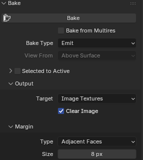 The only real difference after this is to select ‘Emit’ in the bake settings. Again, ensure the image texture is set to Non-Color.