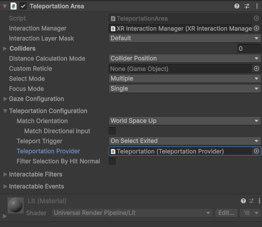 We have a rig, but they can’t move, so next to enter the scene is the XR interaction manager, the Locomotion system, and the teleportation provider. Which will automatically handle the logic.