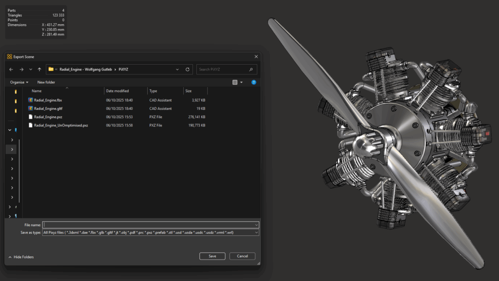 Export from PiXYZ is a relatively easy process. Once optimised and merged to the required level, I can then export and save by adding the file format extension best suited for the context. For going to Blender, I usually go with FBX at this stage.